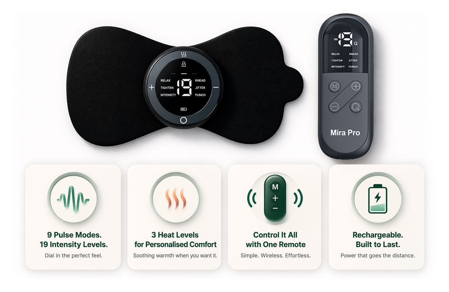 Mira Pro combines TENS (pulse) with soothing heat — giving you a simple, wearable way to personalise your comfort.